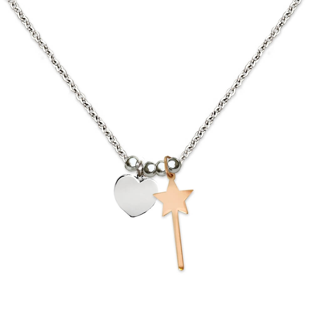 Collana in argento 925 con ciondolo a forma di bacchetta magica e cuore pendente.