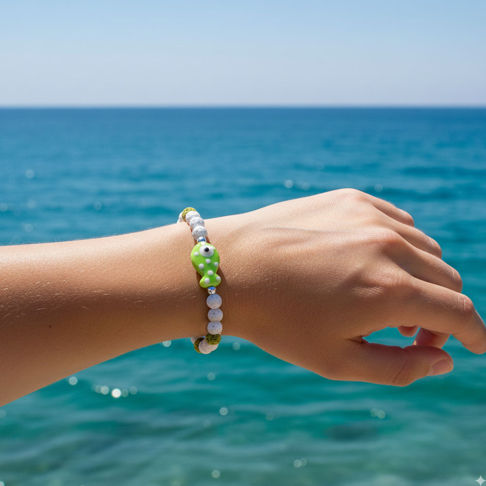 Questo bracciale è ralizzato con pietre laviche naturali nei toni del bianco e del verde: il bianco purifica, il verde rigenera.