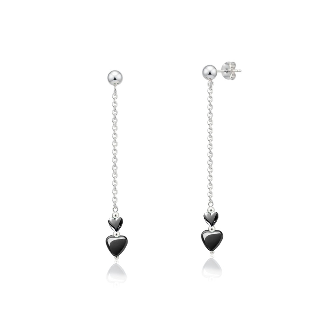 La catena in argento 925, lunga e leggera, termina con due cuori in ematite, pietra dal colore nero metallico che cattura lo sguardo con la sua luminosità intensa.