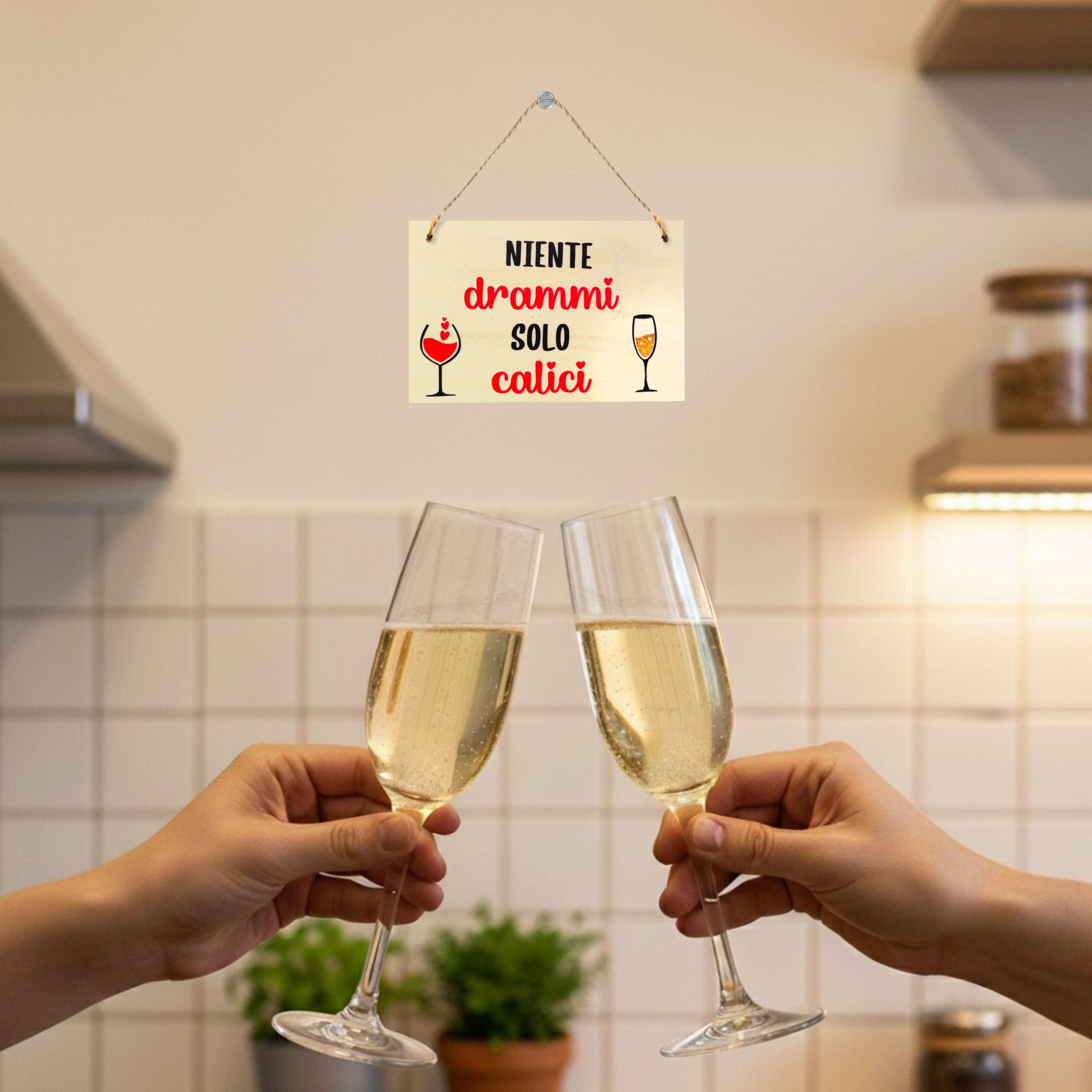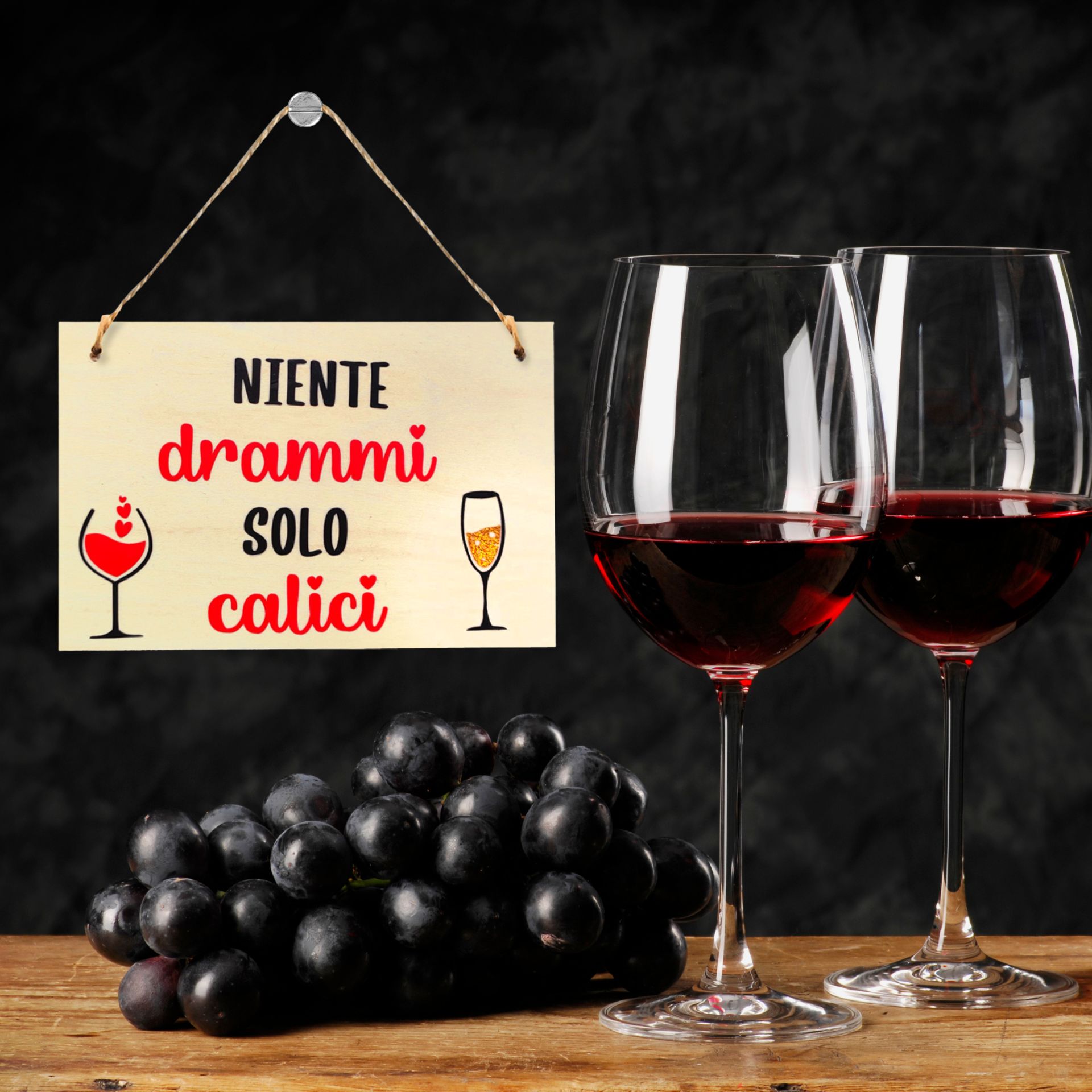 La scritta “Niente drammi, solo calici”, accompagnata da due bicchieri colorati, è il promemoria perfetto per chi ama brindare senza prendersi troppo sul serio.